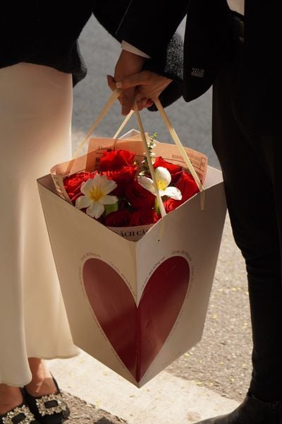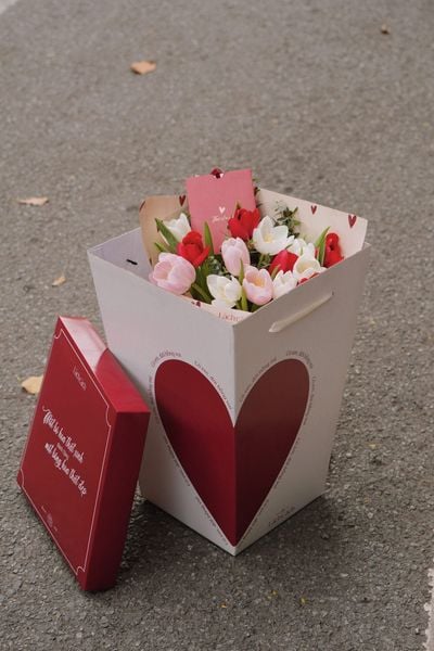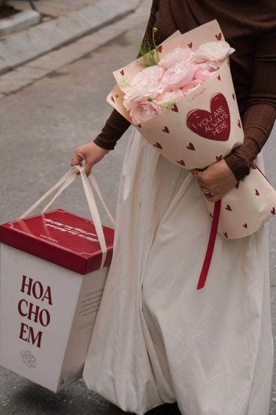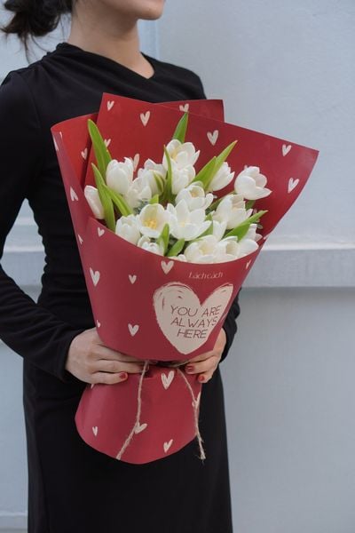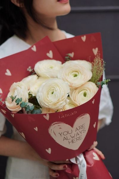Không chỉ có thiết kế vỏ hộp ấn tượng, Lách Cách còn chuẩn bị giấy gói trái tim độc bản nằm trong thiết kế HOA CHO EM. Dù là sắc trắng kem ấm áp hay đỏ rượu nồng nàn, mỗi bó hoa đều mang theo lời khẳng định: "You are always here" - Em luôn ở đây, trong trái tim anh.