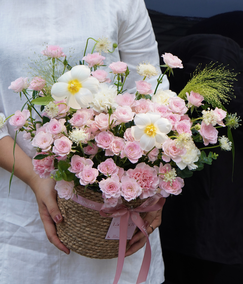 Giỏ cói hồng chùm hồng nhạt