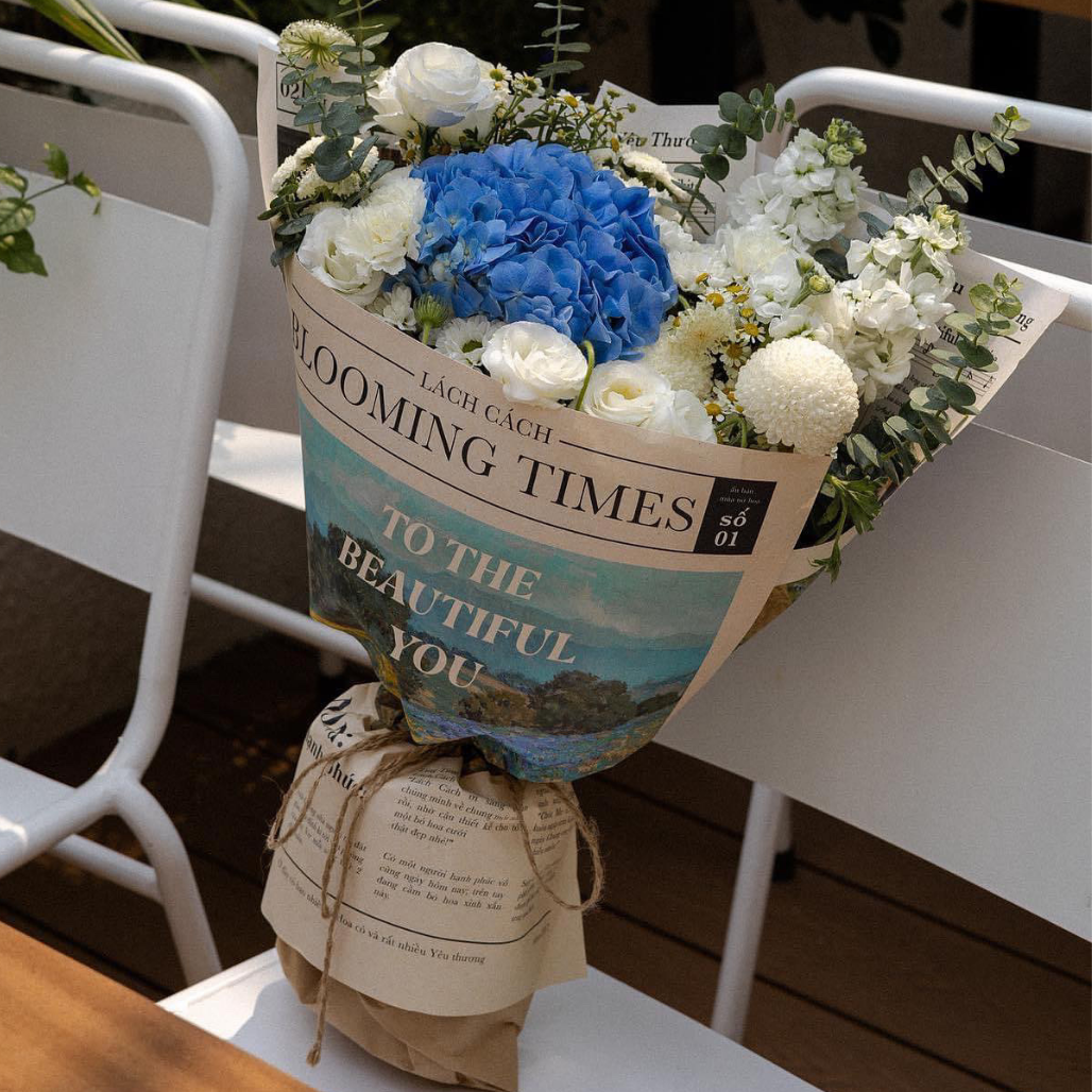 Nguyên liệu: hoa tú cầu xanh dương kết hợp cùng các loại hoa lá phụ: cẩm chướng, lan tường, đồng tiền, lá bạc, cúc tana, cỏ đồng tiền,...