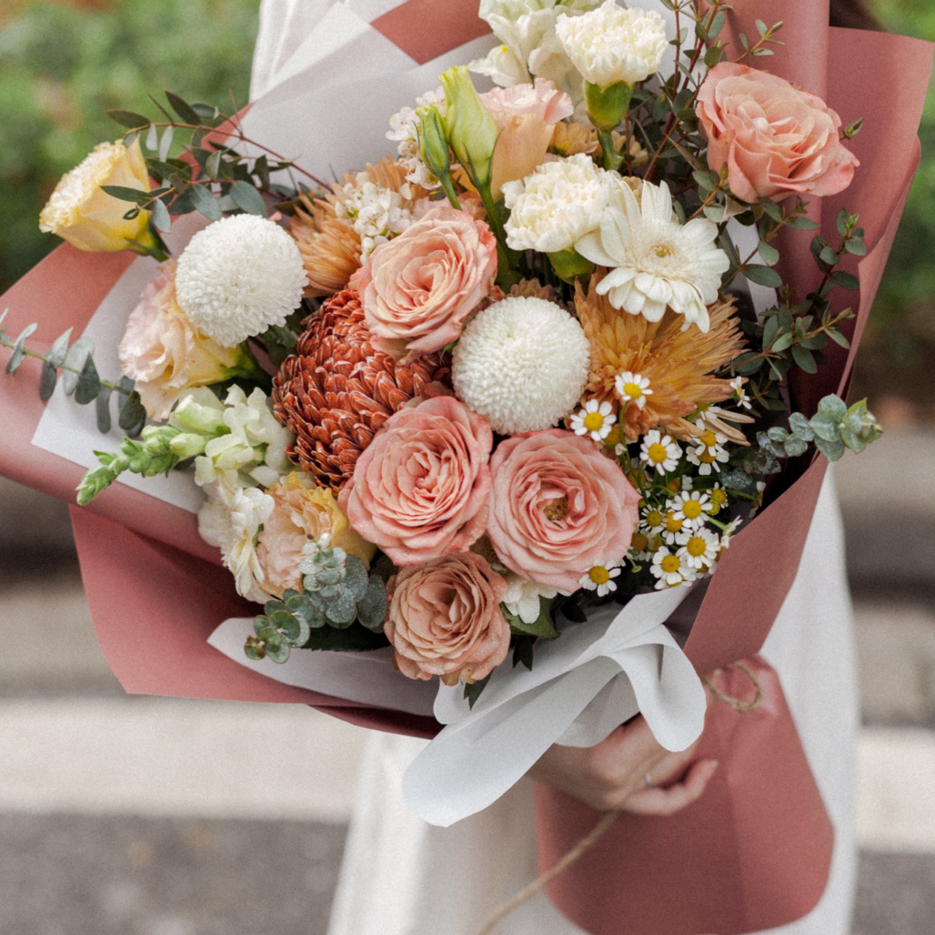 Nguyên liệu: hoa cúc mẫu đơn kết hợp cùng hoa lá phụ: hoa hồng capuchino, hoa đồng tiền, ping pong, lá bạc,...