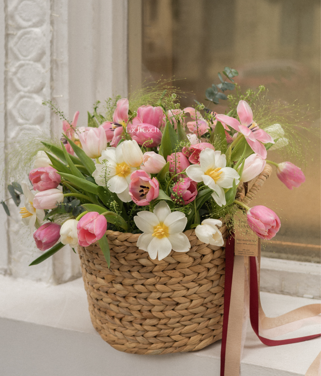 BST 8/3 - Mẫu 14 - Giỏ hoa 40 bông tulip trắng hồng
