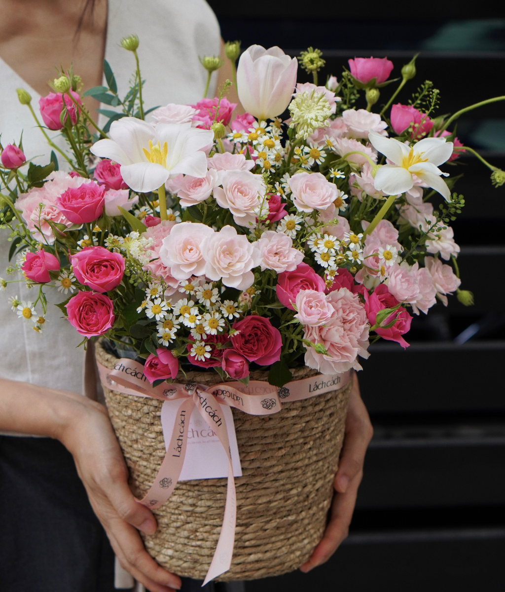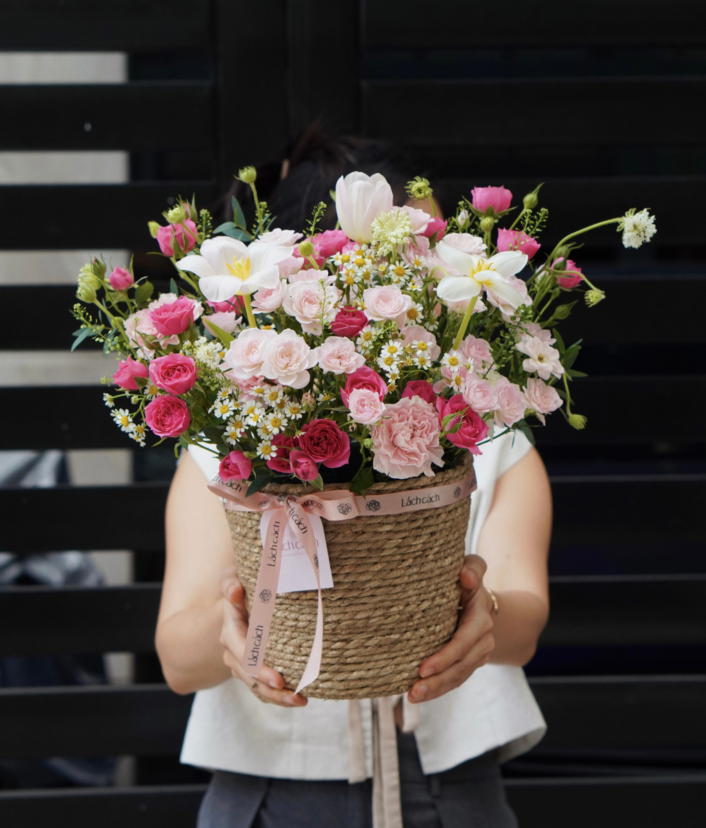 Giỏ cói hồng chùm hồng đậm - nhạt