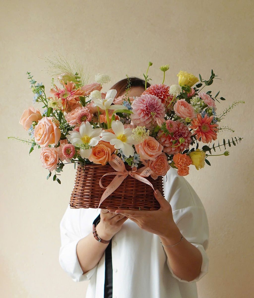 Nguyên liệu: Hoa hồng shimmer cam kết hợp với hoa lá phụ: hoa hồng trắng, ping pong, phi yến, cẩm chướng, lan tường, đồng tiền, cúc chùm, lá bạch đàn,...