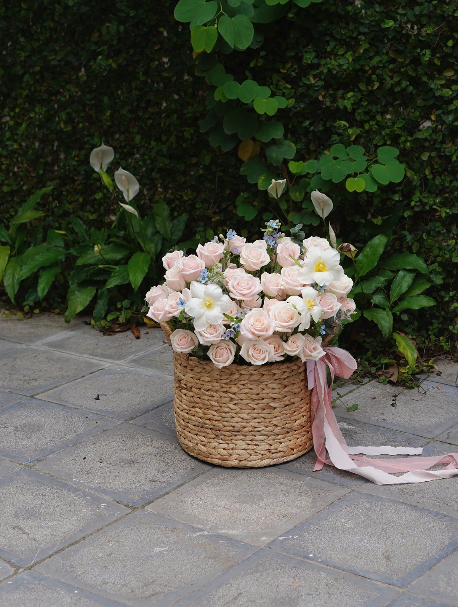 Giỏ lục bình hoa hồng kem dâu