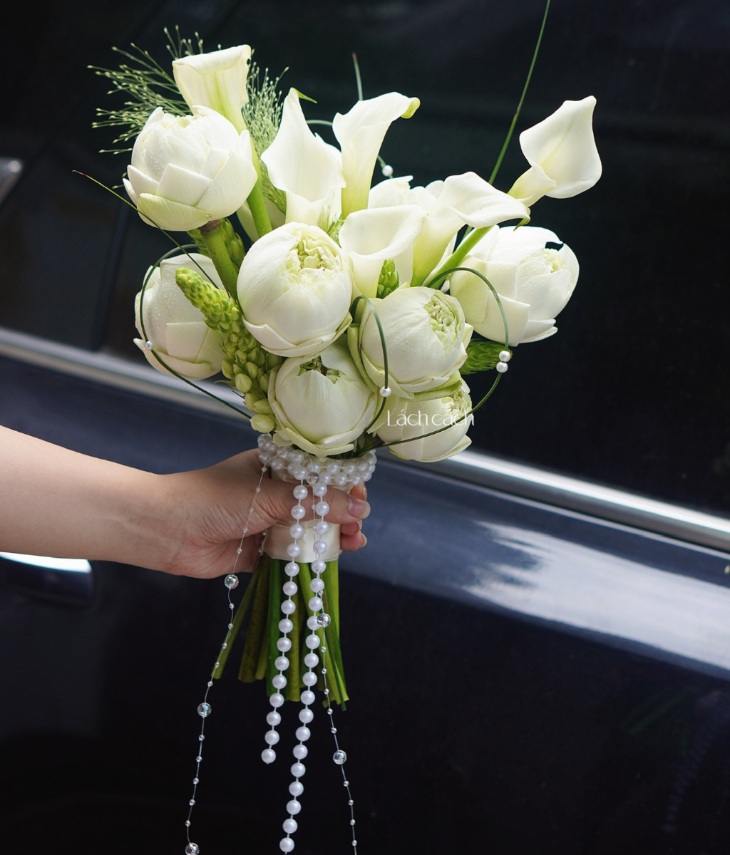 Nguyên liệu: 10 hoa sen trắng, calla lily trắng và các loại hoa lá phụ theo mùa